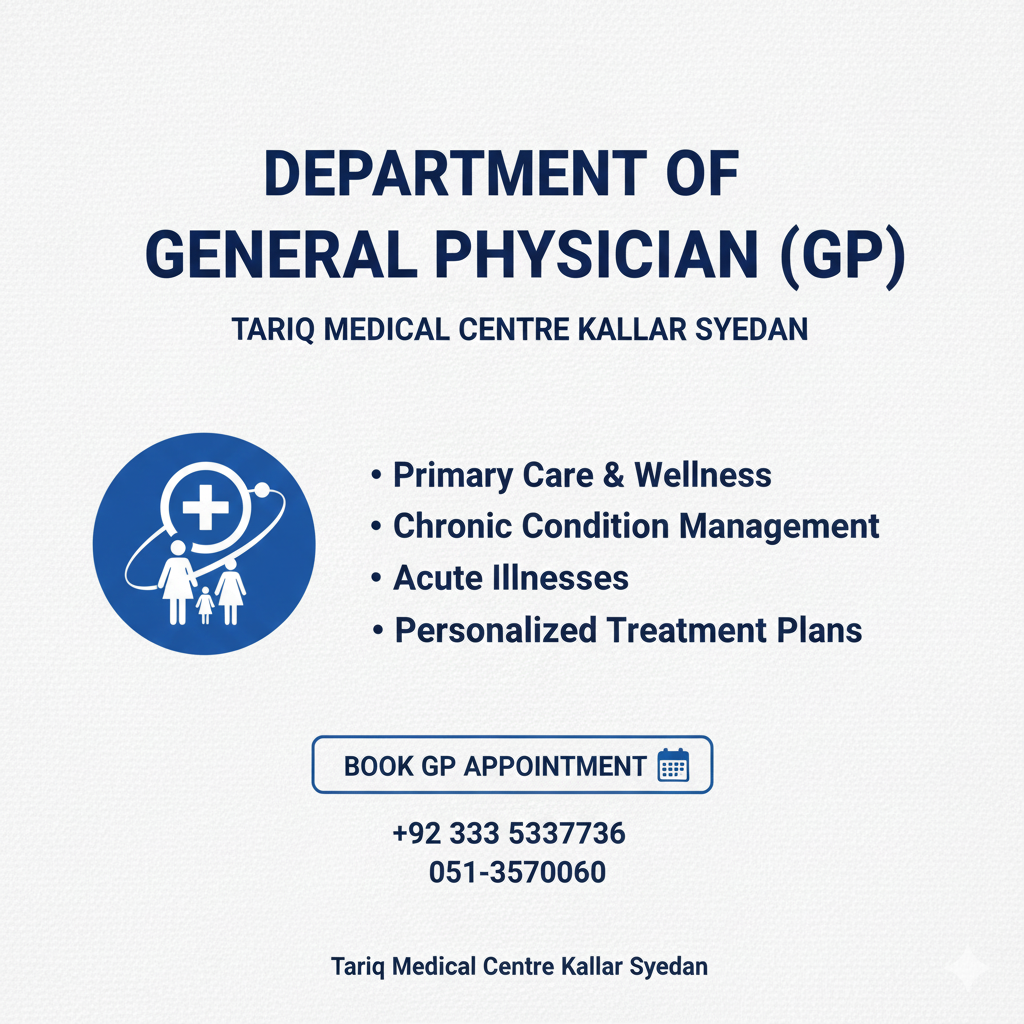 Headed by Dr Sheikh Tariq Riaz himself, the Department of General Physicians (GP) at Tariq Medical Centre, Kallar Syedan, is your first stop for expert primary care and general medicine. Our experienced family doctors provide comprehensive consultation, diagnosis, and treatment for acute illnesses, as well as proactive management of chronic conditions (like diabetes and hypertension). We focus on holistic, personalized care for the whole family. For the best General Physician in Kallar Syedan, search no further. Book your GP appointment for trusted, quality medical services