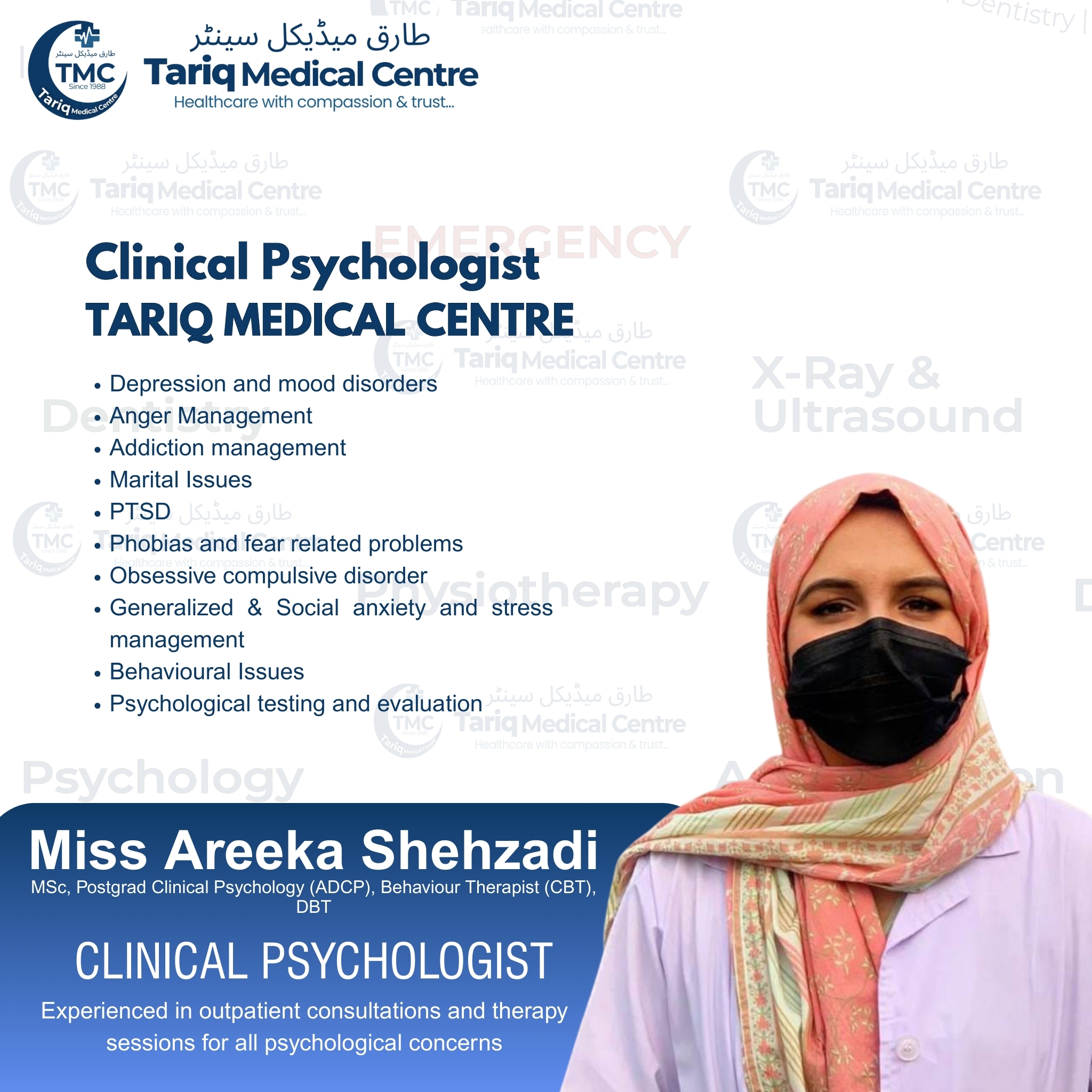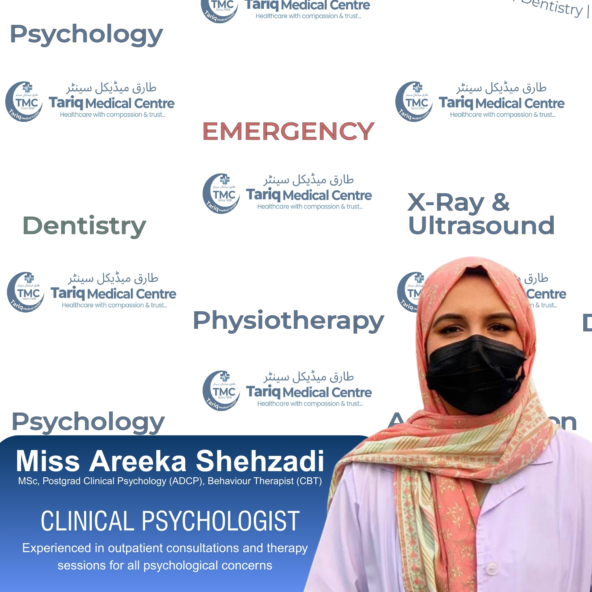 Miss Areeka ShehzadiSpeciality: Clinical Psychologist, Behaviour Therapy, Stress ManagementDept: Clinical Psychologyarikashehzadi5577@gmail.comClinical Psychologist, Behaviour Therapy, Stress ManagementView Profile