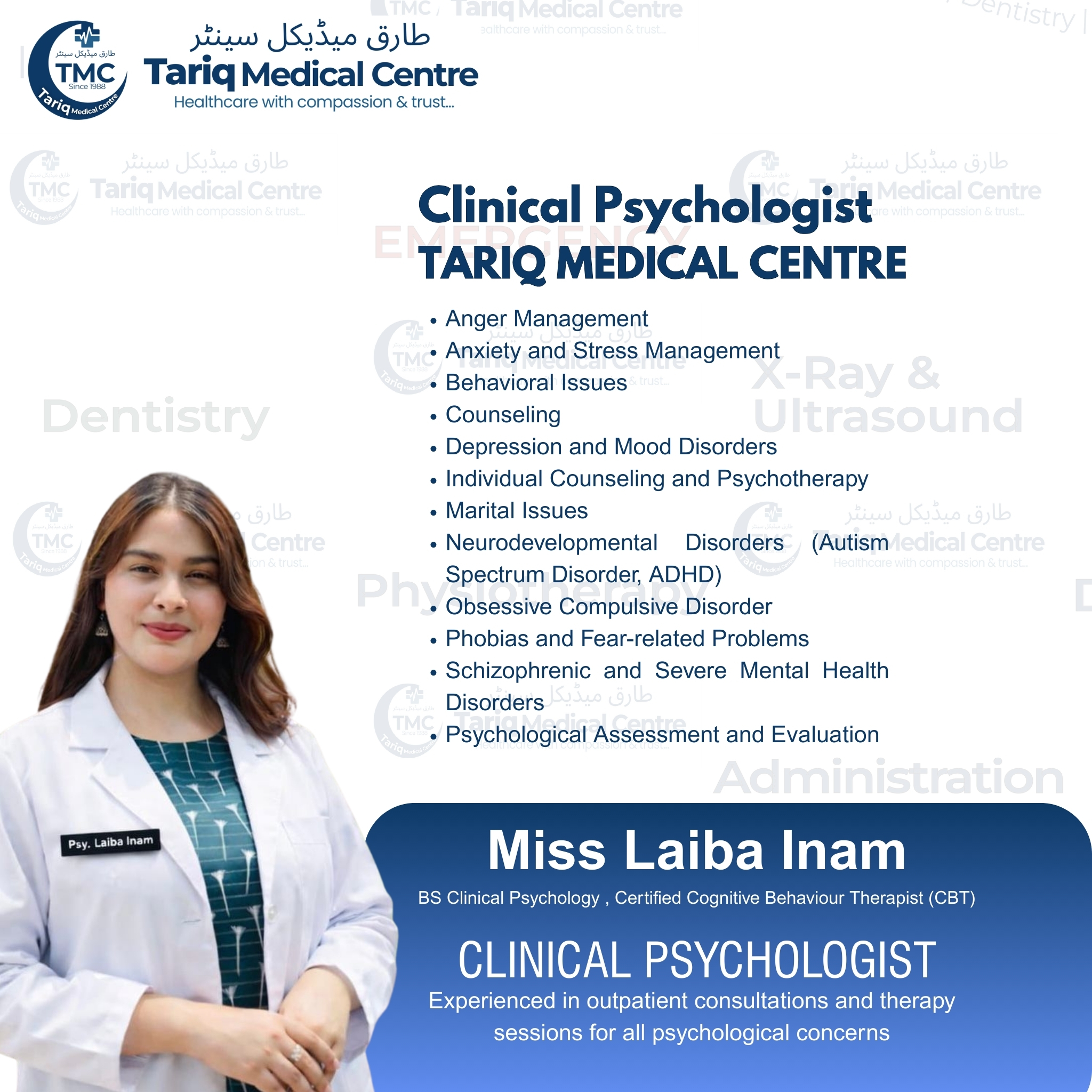 Miss Laiba InamSpeciality: Clinical Psychologist, Behaviour Therapy, Stress ManagementDept: Clinical Psychologyspherepsych9@gmail.comClinical Psychologist, Behaviour Therapy, Stress ManagementView Profile
